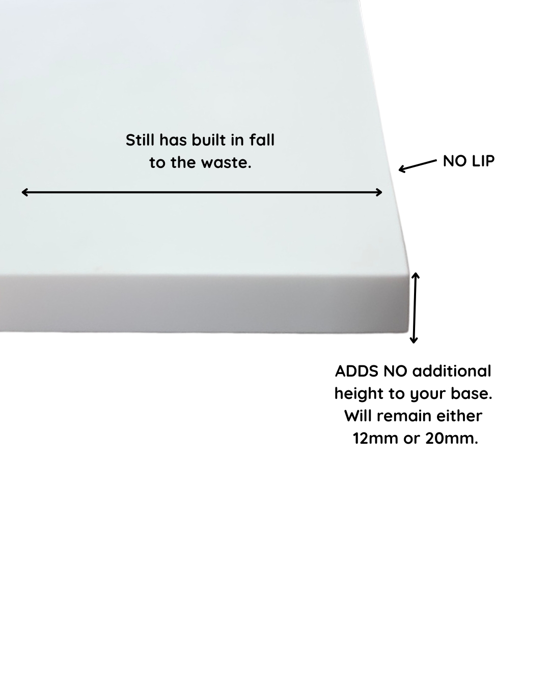 Our custom size shower bases can be made in any size up to 1500mm x 1200mm for the 12mm or 22mm thick bases, or up to 2400mm x 1200mm for the 19mm or 29mm thick bases.